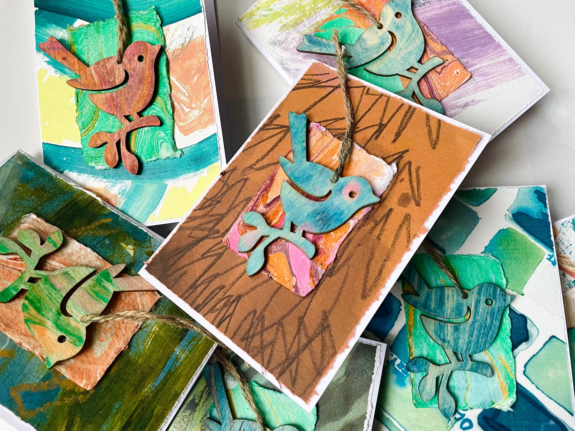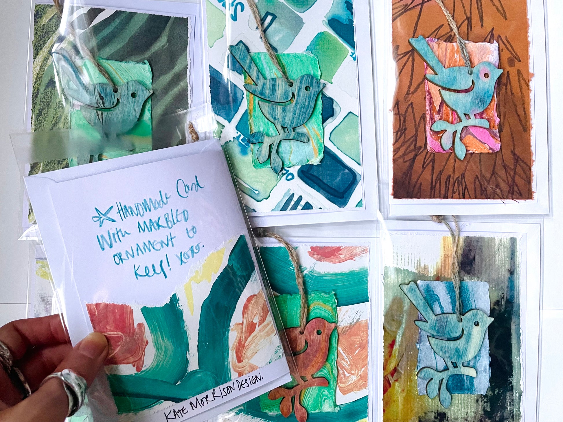 Send your loved ones a handmade Christmas card with hand-marbled paper and a Robin ornament to keep!